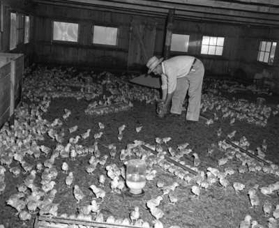 Image shows W. E. May, adjusting a water fountain, to care for the baby chicks for 12 weeks. May runs 13,000 broilers at his farm near Gonzales. Published in Fort Worth Star-Telegram morning edition April 2, 1950.