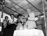 Amon G. Carter with Minnie Meacham Smith Carter and Mrs. Douglas MacArthur. The three are applauding at an event at Farrington Field in Fort Worth where General MacArthur spoke to a crowd of attendees following the parade held in his honor.