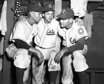 Jack Lindsey, left, and Ray Moore, right, two former Cats who have just returned to the club, huddle with Shortstop Bill Hunter between games at La Grave Field. Published in Fort Worth Star-Telegram morning edition, June 17, 1951.