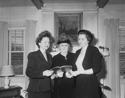 Mrs. E. J. Hosey, center, past worthy grand matron of the Grand Chapter of Texas, Order of the Eastern Star (OES), reminisces with Mrs. J. C. Garlitz, left, associate grand conductress, and Mrs. C. B. Dewees, past presiding officer, over the order's history. It was born 100 years ago. Published in Fort Worth Star-Telegram morning edition, February 15, 1950.