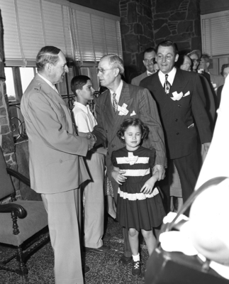 Editors meet the general- At the Texas Press Association convention breakfast in Dallas. General Douglas MacArthur shook hands with 300 editors, their wives and children. The general is shown being greeted by Arthur A. Bagwill, editor of the Plano Star-Courier. Photographers' flash bulbs dazzled Bagwill's 9-year-old granddaughter Linda Kay Sherrill, who also shook hands with the general and his son, Arthur, shown beside him. Published in Fort Worth Star-Telegram morning edition June 17, 1951.
