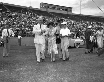 Marshall Kennady and Lt. Col. Anthony Story escort Mrs. Douglas MacArthur and her son, Arthur, to speaker's platform at Farrington Field. Published in Fort Worth Star-Telegram morning edition June 17, 1951.