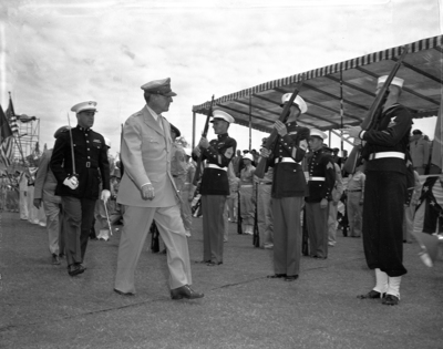 General Douglas MacArthur inspecting a marine honor guard. Marine honor guards are standing in position while holding their riffles. Published in Fort Worth Star-Telegram morning edition June 17, 1951.