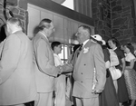 P. B. Vandement, right, of the Montague County Times in Bowie had a warm handshake for General Douglas MacArthur, left. Published in Fort Worth Star-Telegram morning edition June 17, 1951.
