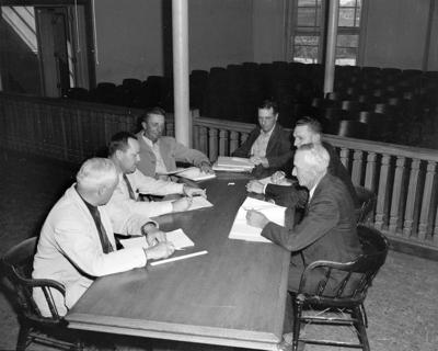 The supervisors of the new Runnels County Soil Conservation District talk plans for their work as members meet with agricultural workers. Pictured, left to right: County Agent John Barton, Distict Soil Conservationist Olen Fenner, K. B. Robinson of Winters, Pete Giesecke of Ballinger, Clarence Spill of Winters and Louis Rohmfeld of Rowena. Published in Fort Worth Star- Telegram morning edition, February 26, 1950.