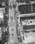 Ariel view of street in downtown Fort Worth during the parade to welcome General Douglas MacArthur. Members of the military are marching down the street while spectators of the parade stand on the sidewalks.