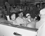 Mrs. MacArthur and her son, Arthur MacArthur waving to crowd of spectators from their automobile for their welcome parade in Downton Fort Worth.