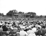View of the stage at Farrington Field, in which General Douglas MacArthur gave his "old soldiers" address. The stage is decorated with flags of the United States. Soldiers are standing in front of the stage next to photographers.