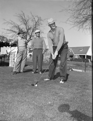 Jack Reedy, takes aim at Worth Hills from Number 10 tee during friendly golf joust with Spencer Normand, left, and Allen Morris. Published in Fort Worth Star-Telegram morning edition February 19, 1950.