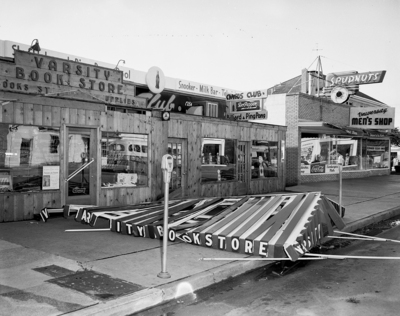 High winds ripped the metal awning from the front of Varsity Book Store, 3057 South University Drive, scattering it on the sidewalk in front of the store. Numerous signs were blown down or damaged around town. Pictured is a book store metal awning which was blown down during a storm. Published in Fort Worth Star-Telegram evening edition June 16, 1951.