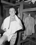 William Glane, southpaw pitcher who has just joined the Cats, mojos up after a shower. Published in Fort Worth Star-Telegram morning edition, June 18, 1951.