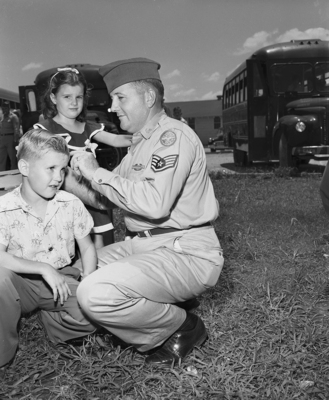 Boys and girls from Fort Worth children's homes play at Carswell Air Base with their adopted "fathers" for the day. Staff Sergeant Jack L. Waddell combs the hair of Dickie Harrell, 9, as his own daughter, Collen, 6 watches critically. Published in Fort Worth Star-Telegram morning edition June 18, 1951.