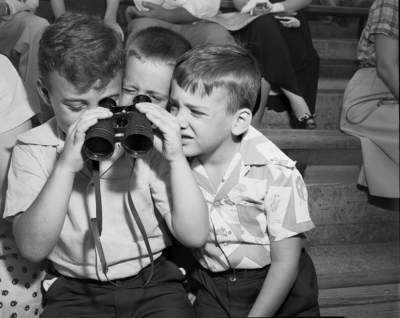 Three boys used opera glasses to get a close-up of General Douglas MacArthur as he gave his speech. They are, left to right, Rusty Maisel, 7, Tommy Giles, 5, and Sammy Maisel, 5. Published in Fort Worth Star-Telegram morning edition June 17, 1951.