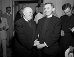 Ceremonies marking the 25th anniversary of the ordination of Reverend Philip O'Regan, Order of Saint Benedict, pastor of Saint Mary's Catholic Church. Monsignor Joseph G. O'Donohoe of Saint Patrick's Church, left, shown with Father O'Regan, was a speaker at the silver jubilee. A group of unidentified men can be seen in the background. Published in Fort Worth Star-Telegram evening edition June 18, 1951.