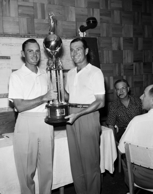 Image shows Ernie Vossler, left, with Lacy Boggess, right, president of Colonial receiving the Founders Trophy at annual club championship tournament at Colonial . Published in the Fort Worth Star-Telegram evening edition June 18, 1951.