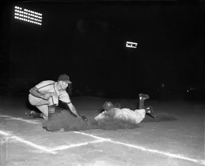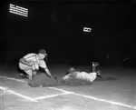 Jack Lindsey, Cat third baseman, raises a young sandstorms as he beats the ball back into first base on an attempted pick-off at La Grave Field. The Houston first baseman is Jerry Witte, who had taken a snap throw from Les Fusselman the Buff catcher. This happened in third inning. Published in Fort Worth Star-Telegram morning edition, June 19, 1951.