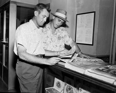 Houston First Baseman Jerry White and Catcher Les Fusselman read up on Cats after arrival. Fusselman, right, hit homer in 11th to win the game. Published in Fort Worth Star-Telegram evening edition, June 19, 1951.