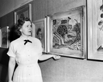 Mrs. Herbert M. Jacobs will pack plenty of sketchbooks when she, Joanne, 10 and Bobby, 5, leave to join Major Jacobs on Okinawa, where he is district commander of the air base. Mrs. Jacobs is standing by a scene she painted on the William Fuller place on White Settlement Rd. The picture is included in an exhibition of work at Lon Hellums gallery by members of the art class conducted by Mrs. Muriel Francis at Carswell Air Base.