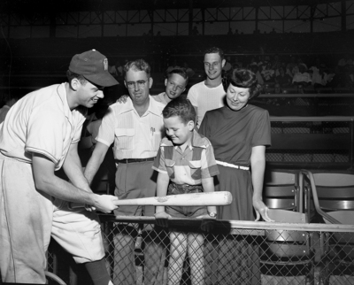 "Family Night" at La Grave Field brings out the whole family - Mr. and Mrs. A. Z. Parks look on as Bill Hunter demonstrates a bat grip for their son, Alton Z., Jr. Behind are Mike Williams, the younger and his brother, Bob. Published in Fort Worth Star-Telegram morning edition June 24, 1951.