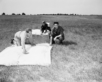 Sergeant Charles L. Stephens, left, and Corporal R. A. Breeden, right, both of Dallas, help Sergeant Jack Burkham of 411 Saint. Louis, Fort Worth, center, lay out white target panels before the planes arrive. Parachutes are shown flying above in the photograph. Published in Fort Worth Star-Telegram morning edition June 19, 1951.