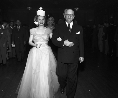 Miss Rose Marie Roth, chosen queen of the Laneri High School Booster Club's Mardi Gras Ball, walks with Mayor Deen during the grand march. She represented the Senior Catholic Youth Organization.