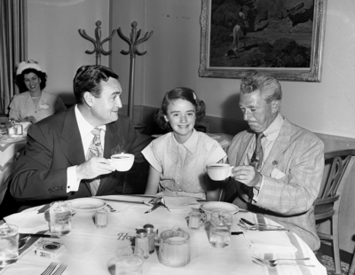 Eleven years ago, band leader Ran Wilde, left, and Bobby Peters, right drank coffee together in Cincinnati while Wilde nervously waited to become a father. In Fort Worth Wilde, Peters, and 11 year old Mimi Wilde (the object of her father's nervousness) relived the Cincinnati episode. Published in Fort Worth Star-Telegram morning edition June 19, 1951.