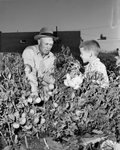 Vander Key, had lived on a farm all his life until he moved to the city. He still uses his green thumb with a small city garden. Key and one of his grandsons, James T. Key, Jr., 7, are looking over their onion and tomato plants. Published in Fort Worth Star-Telegram morning edition June 24, 1951.