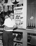 Image shows J. A. (Jack) Hybarger posed next to annual Rockwood Golf Tournament sign. To his left and right is golf souvenirs and golf clubs. Published in the Fort Worth Star-Telegram evening edition June 21, 1951.