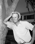 Image shows Billy Bob Coffey, three time champion at River Crest Invitation, pondering next to tree about his score of 76. He is leaning on tree outside of unidentified house. Published in the Fort Worth Star-Telegram evening edition June 21, 1951.