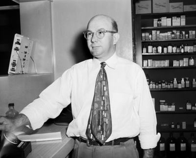 Portrait of W. B. Kirkpatrick wearing a tie and glasses. Behind him there is a shelf with containers that appear to be medicine. Published in Fort Worth Star-Telegram evening edition June 21, 1951.
