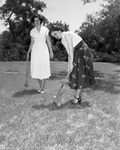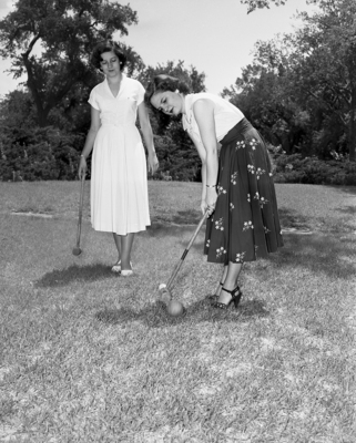 Miss Nancy Hall, right, entertained her house guest, Miss Mary Alice Wright with a cold drink party at the home of the hostess' mother, Mrs. William K. Hall. Published in Fort Worth Star-Telegram evening edition June 21, 1951.