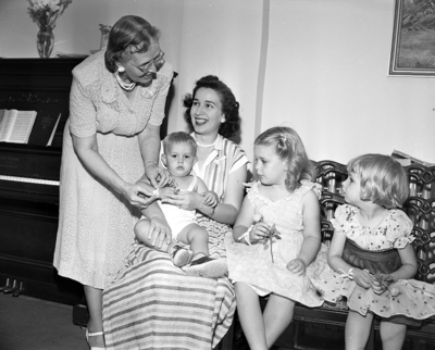 Mrs. L. Berry, left, tied the white ribbon of the Women's Christian Temperance Union on three of her grandchildren in ceremonies held by the Women's Christian Temperance Union at Cumberland Rest. It was the third generation of Mrs. Berry's family to wear the emblem. The children are, left to right, John Reynolds, held by his mother, Mrs. Wayne Reynolds, Betty Jane Reynolds, and Janet Spain, daughter of Mr. and Mrs. A. O. Spain. Published in Fort Worth Star-Telegram evening edition June 28, 1951.