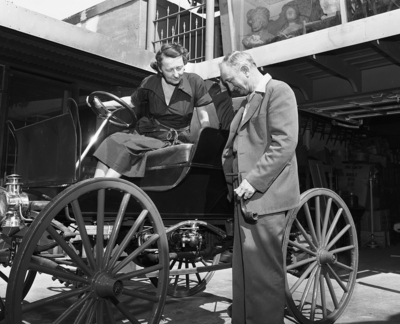 Dave Whitehead is ready to crank up his 1897 Winton, but where does the crank go? Mrs. Whitehead, in car, can't figure it out either.