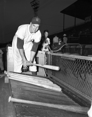 First Baseman Ben Taylor selects his timber. He leads Cats with.303 battling average, 10 home runs and 50 runs batted in. Published in Fort Worth Star-Telegram evening edition, June 26, 1951.