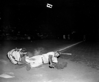 Cats' Mickey Livingston is tagged out by Shreveport's Ted Bosiack after lining triple to right-center in seventh inning. Livingston stopped at third as Second Baseman Chico Garcia hobbled relay, then started home too late to beat Garcia's recovery and throw. Published in Fort Worth Star-Telegram evening edition, June 22, 1951.