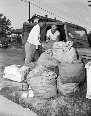 Rural route carriers W. R. Reynolds, left, and Tommie L. Gay. With O. L. Walker, not shown. Getting ready to distribute 1,552 sample bottles of a liquid soap product in addition to regular mail in the summer heat. The carriers filled 19 bags averaging more than 75 pounds at the Poly post office. Published in Fort Worth Star-Telegram evening edition June 21, 1951.