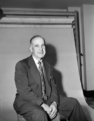 Portrait of Ralph J. Beaver wearing suit. He is sitting and holding both of his hands together. Behind him is a paper photography backdrop background. Published in Fort Worth Star-Telegram morning edition June 22, 1951.