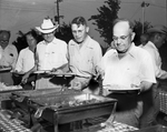 Helping themselves to the barbecued beef at the outing, left to right, were: Buddy Hale one of the organizers of the National Oil Scouts and Landmen's Association; M. G. Cheney, president of Anzac Oil Corporation, and Tom F. Grisham, pioneer operator in West Central Texas. Published in Fort Worth Star-Telegram morning edition June 24, 1951.