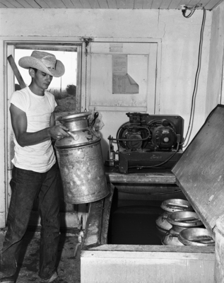 Milking finished, Garland stores the full cans in the dairy barn cooler as the milk is prepared for market. the Carrolls have a complete Grade A dairy barn. Published in Fort Wort Star-Telegram July 1951.