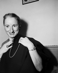 Mrs. Frances Guyton, office deputy in Constable Wilson's office, models the $7,000 necklace recovered by Deputy Oliver Evans. Published in Fort Worth Star-Telegram evening edition June 22, 1951.
