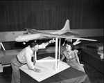 C. B. Shumaker touches the wheels of a B-26 wind tunnel model he made for Convair in 1952. Watching with interest is Mrs. Fred Shuter, of the Convair Public relations staff. Published in Fort Worth Star-Telegram morning edition June 24, 1951.