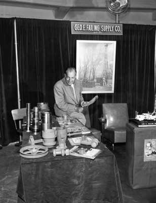 H. J. Godschalk sits on a table stacked with parts for the George E. Failing Supply Company's water driller, designed for transport by C-54. Published in Fort Worth Star-Telegram morning edition June 24, 1951.