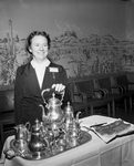 Portrait of Mrs. John Hilty. She is wearing a uniform with a name tag while holding a teapot with her left hand. On the table in front of her are teaspoons and a tea set. Published in Fort Worth Star-Telegram morning edition June 23, 1951.
