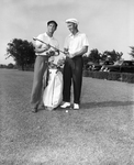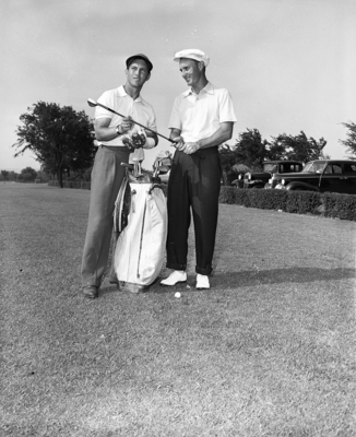 Image shows Ernie Vossler, right, holding golf club, talking with Richard (Punk) Patton, right, golf caddy for Vossler. He has a broken arm with a bandage on arm standing next to golf bag. Published in the Fort Worth Star-Telegram evening edition June 23, 1951.