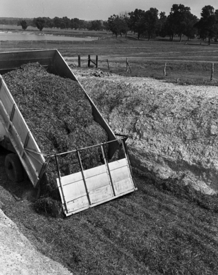 Three tons of silage are dumped into the pit here on the Boswell farm, where it will be packed for preserving until next winter. Published in Fort Worth Star-Telegram July 1951.