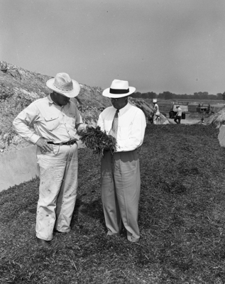 Randolph Foust, left, the farm foreman, and Boswell check the silage mixture after it is placed in a pit with ground milo for a preservation. Published in Fort Worth Star-Telegram July 1951.
