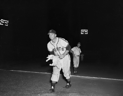 Manager Salty Parker of the Sports grins as he ejects a stray cat from vicinity of third base. Published in Fort Worth Star-Telegram morning edition, June 24, 1951.