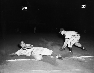 The Cats' Bill Hunter keeps well away from Vern Petty and the ball as he slides into third base in the fourth inning of Shreveport-Fort Worth game at La Grave. The advance from first base came on Gene Cimoli's single. Published in Fort Worth Star-Telegram morning edition, June 24, 1951.
