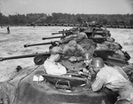 The 49th Armored Division has been in two-weeks' training at Camp Polk and citizen soldiers of the group have been learning the lessons of war all over again. Taking a break during a cleanup session on a Company B 249th Heavy Tank Battalion tank are Sergeant Edward J. Eastwood, Sergeant First Class Carl W. Hardin, Sergeant First Class Ben E. Blitch, and Sergeant Travis P. Mayfield. Published in Fort Worth Star-Telegram morning edition June 24, 1951.