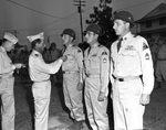 Lieutenant Colonel Robert F. Chollar, commanding officer of the 145th Tank Battalion, presents Bronze Stars won in World War II to, left to right, 2nd Lieutenant Eugene T. Lawson, Sergeant First Class Alfred J. Foley, and his brother, Sergeant James B. Foley. Published in Fort Worth Star-Telegram morning edition June 24, 1951.